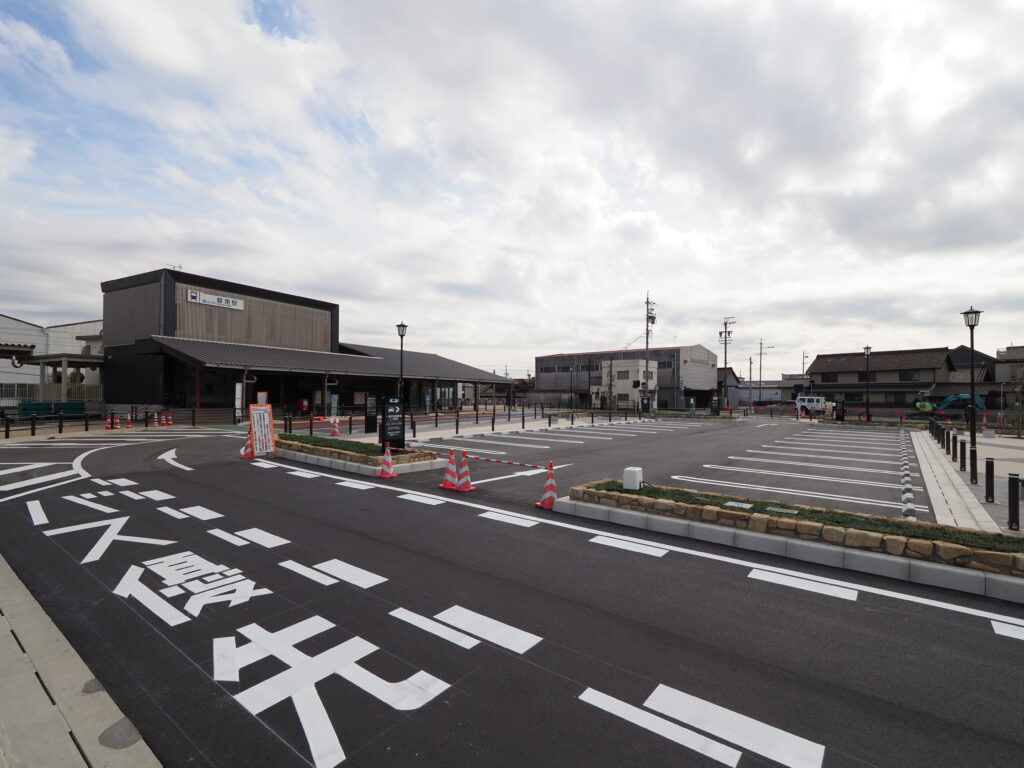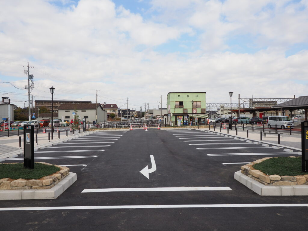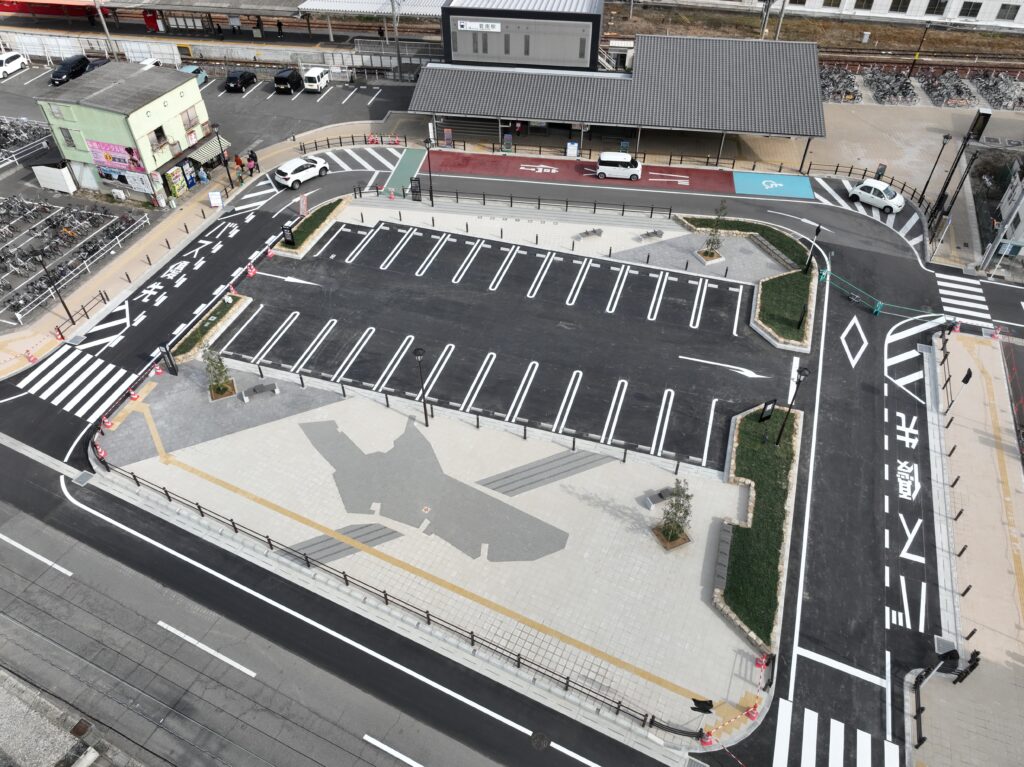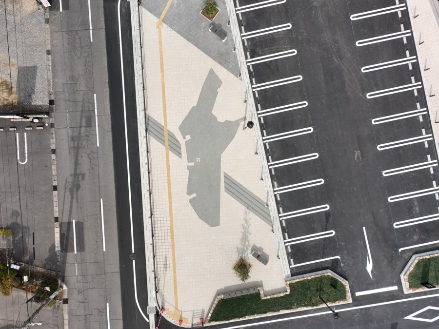 碧南駅前の利便性が格段に上がりました。 ドローン撮影で見ると分かりやすいですが、歩道広場に碧南市の形がブロックで デザインされており、碧南駅の場所に「現在地」と印があります。 思わず下を向いて歩いてしまいそうな、楽しいデザインになっています。